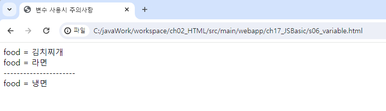 var food = '김치찌개'; //변수 선언 및 초기화