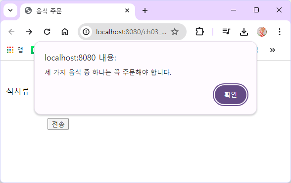 alert('세 가지 음식 중 하나는 꼭 주문해야 합니다.');