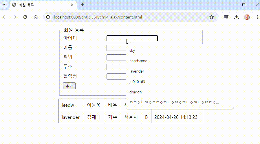 sql = "INSERT INTO people(id,name,job,address,blood_type,reg_date) VALUES(?,?,?,?,?,SYSDATE)";