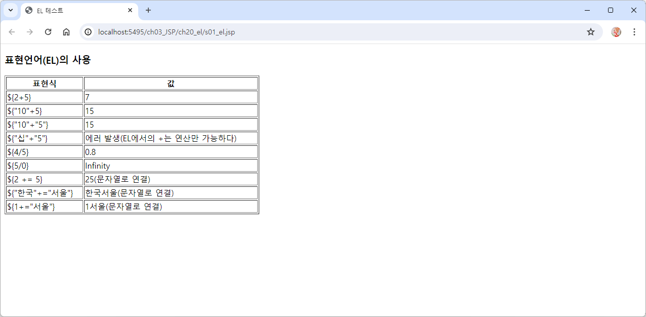 <td>${"한국"+="서울"}(문자열로 연결)</td>