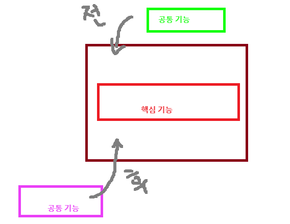 로깅과 같은 기본적인 기능에서부터 트랜잭션이나 보안과 같은 기능에 이르기까지 어플리케이션 전반에 걸쳐 적용되는 공통기능을 핵심 기능과 분리해서 모듈로 구현한 뒤 핵심 기능이 수행될 때 필요로 하는 곳에 공통기능이 적용되게 하는 기능이다.