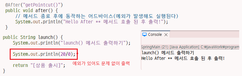 | <aop:after> | 메서드가 적상적으로 실행되느니지 또는 예외를 발생시키는지 여부에 상관없이 적용되는 Advice를 정의한다. try-catch-finally에서 finally 블록과 비슷하다. |
