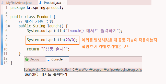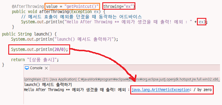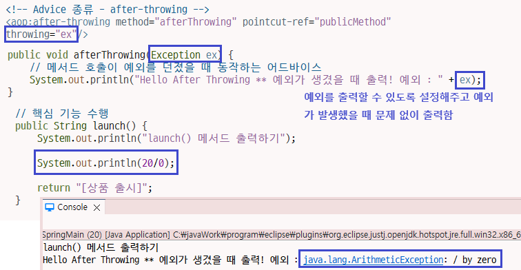 | <aop:after-throwing> | 메서드가 예외를 발생시킬 때 적용되는 Advice를 정의한다. try-catch블록에서 catch 블록과 비슷하다. |