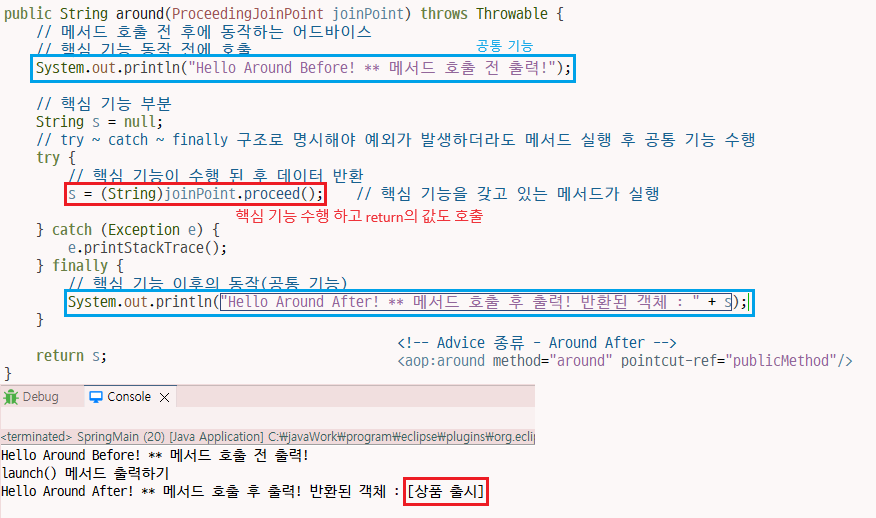 | <aop:around> | 메서드 호출 이전, 이후, 예외 발생 등 모든 시점에 적용 가능한 Advice를 정의한다. |
