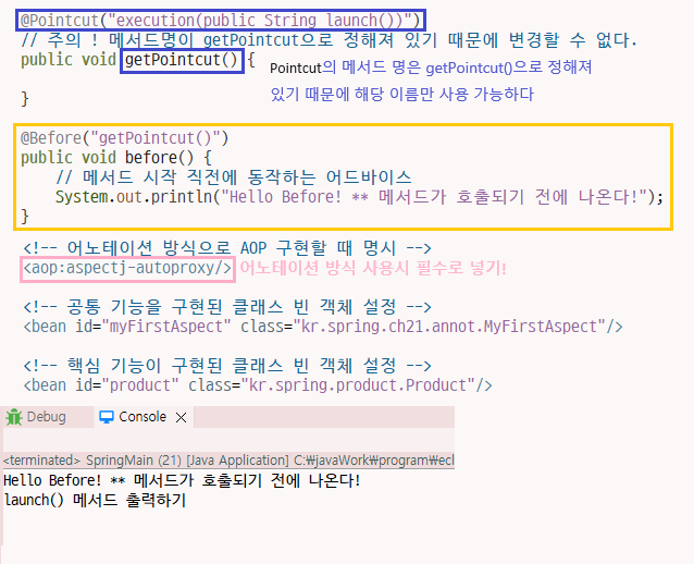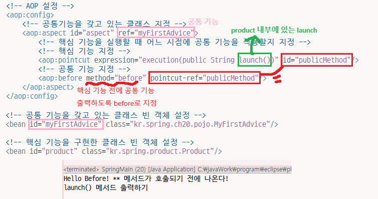 | <aop:before> | 메서드 실행 전에 적용되는 Advice를 정의한다. |