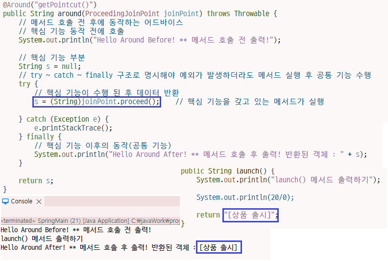 | Around Advice | 대상 객체의 메서드 실행 전, 후 또는 예외 발생 시점에 공통 기능을 실행하는데 사용 |