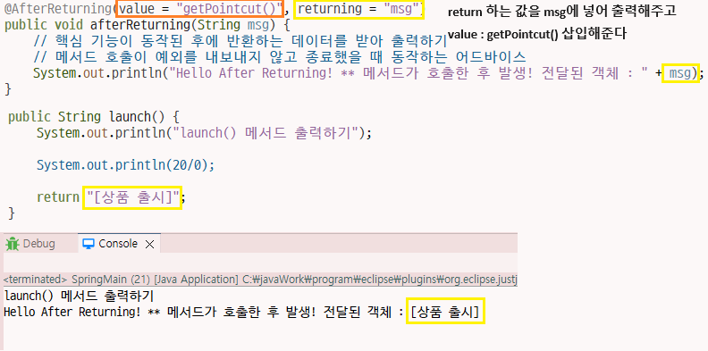 | <aop:after-returning> | 메서드 정상적으로 실행된 후에 적용되는 Advice를 정의한다. |