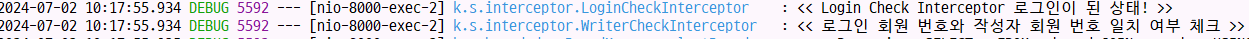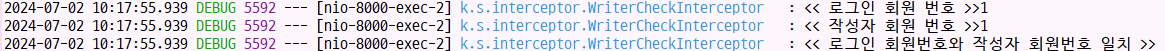 log.debug("<< 로그인 회원 번호와 작성자 회원 번호 일치 여부 체크 >>");