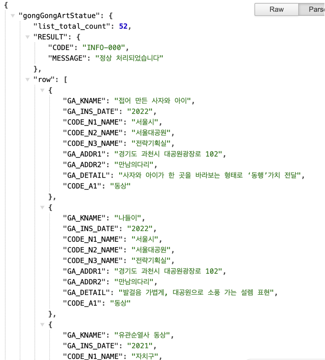 공공데이터 중에 흥미있어 보이는 "서울시 동상 현황"을 선택했다.