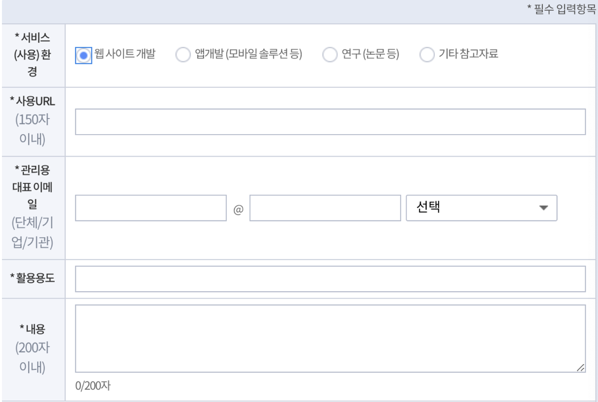 개인 인증키가 있어야 api를 사용할 수 있기에, 정보를 입력하고 인증키를 발급하자.
