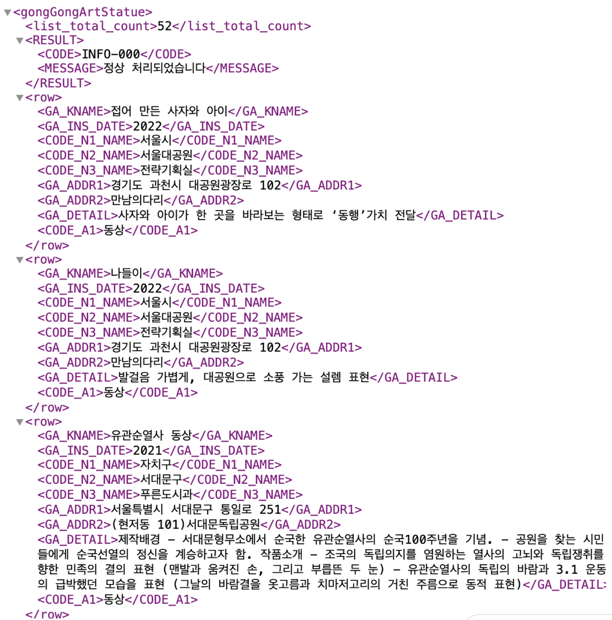 샘플 URL코드에 발급받은 개인 인증키를 넣고, 본인이 원하는 확장자(xml 또는 json)을 입력해주면, 해당 링크에서 데이터를 바로 볼 수 있다.