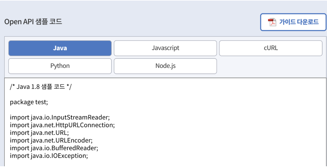 [open api 이용방법] 탭에 들어가면, open API 셈플코드가 존재한다.