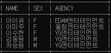 SELECT NAME, SEX, AGENCY FROM celeb WHERE AGENCY = 'YG엔터테인먼트';