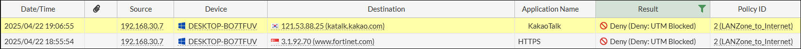 카카오톡 및 URL www.fortinet.com 차단 로그 확인