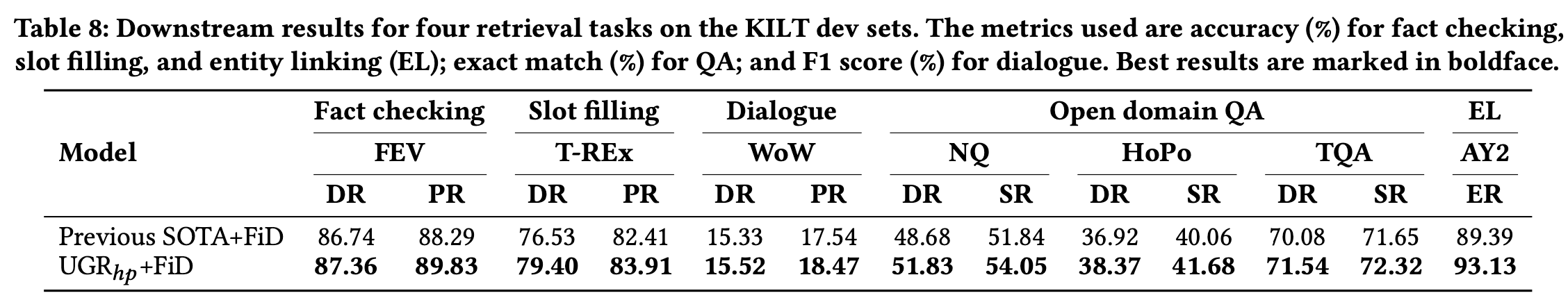 (RQ4) Can relevant contexts retrieved by UGR improve the performance of downstream tasks in KILT?
