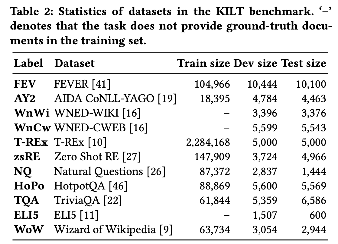 - KILT benchmark를 사용 : 모든 태스크들은 wikipeida 에서 문서를 가져와서 올바른 정답을 생성할 수 있게끔 해야 한다.