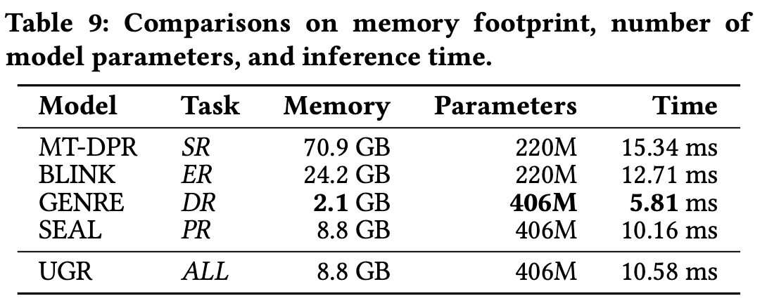 - prefix tree 방식으로 디코딩을 하는 GENRE와 다르게, SEAL과 UGR은 FM-index 방식의 디코딩을 진행하기 때문에 메모리와 inference 타임이 더 많이 드는 것을 확인할 수 있었다. (여기서 GENRE와 SEAL은 각 task 별로 따로 학습시켜야 하는 반면, UGR는 모든 task에서 unified 하게 사용될 수 있다는 점이 다르다.)