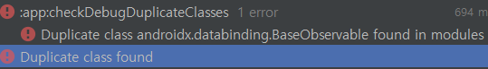 개발을 하다가 오류가 발생하였고 빌드 실패 사항을 보면 :app:checkDebugDuplicateClasses도있는데 이거는 밑에의 Dupicate class found와 같은 의미 오류라고 생각하시면 됩니다.(실제로 Dupicate class found해결 하면 같이 해결되요.)