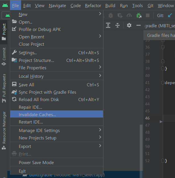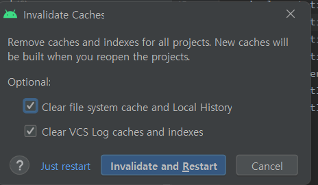 먼저 파일에서 Invalidate Chaches를 실행해서