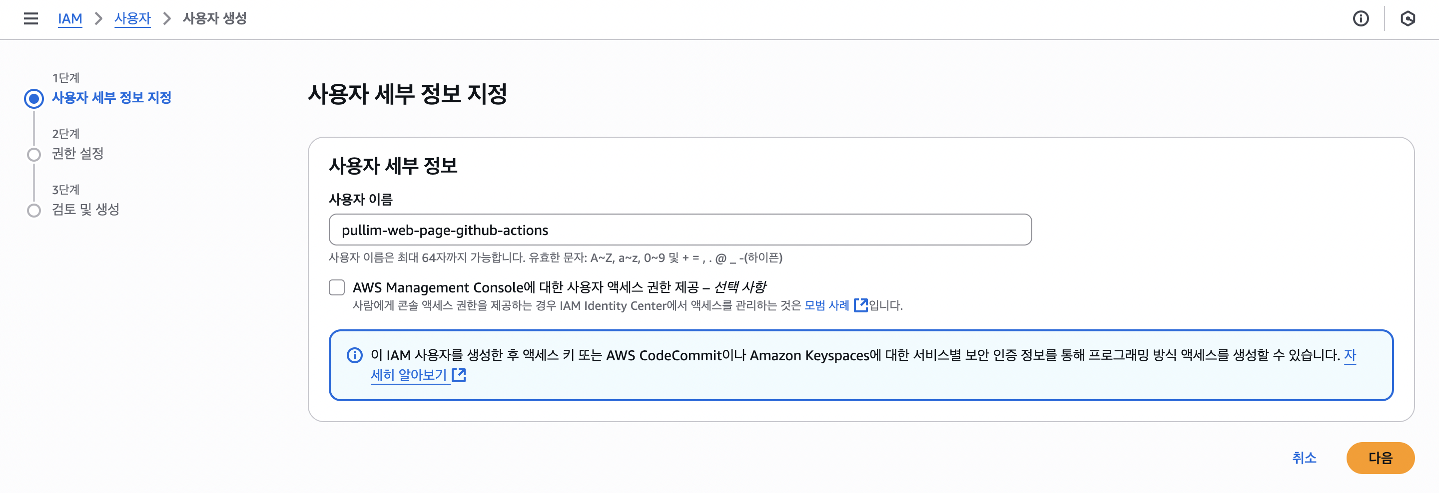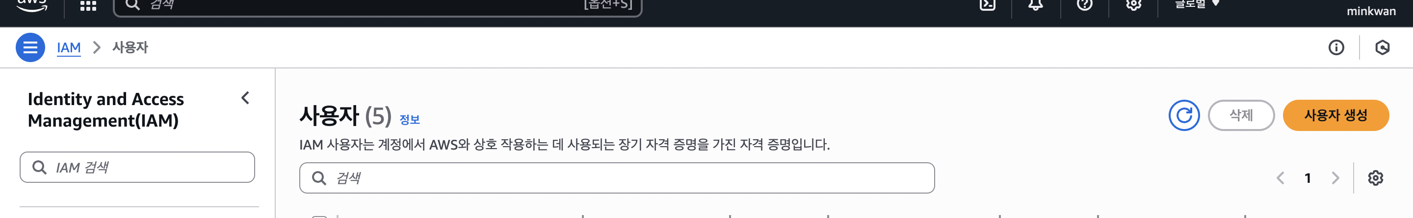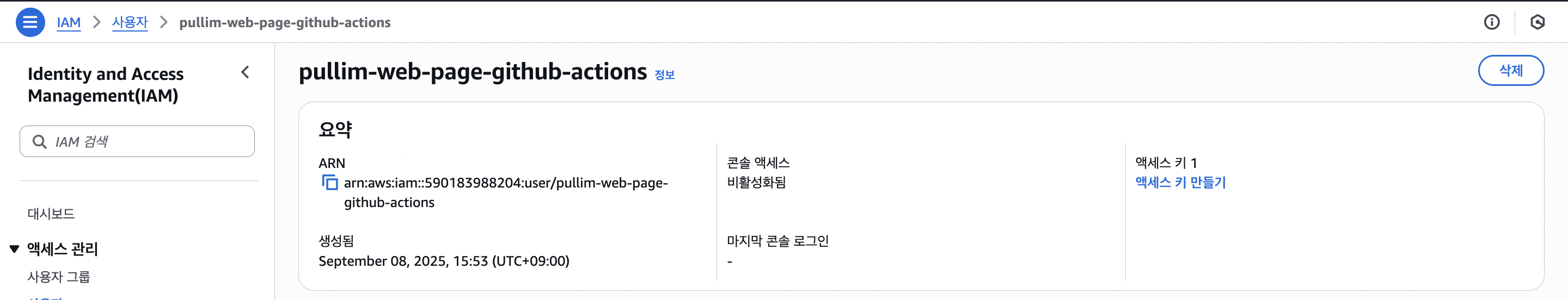 그다음 IAM에서 권한을 설정한 후, Access Key와 Access Secret Key를 발급받습니다.