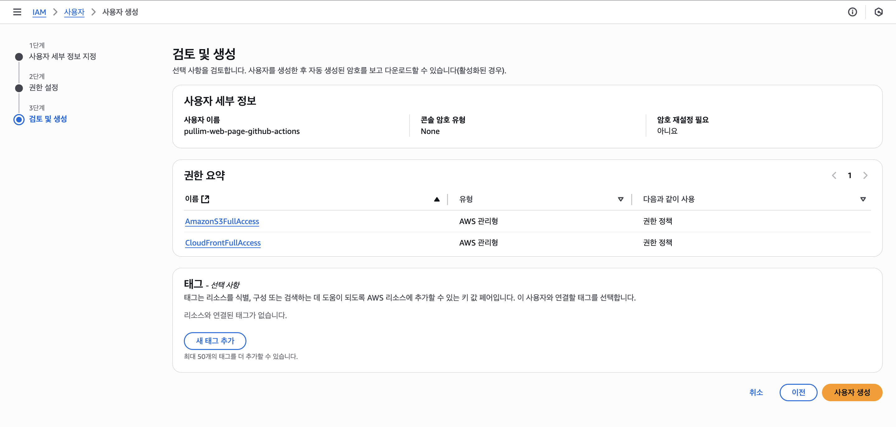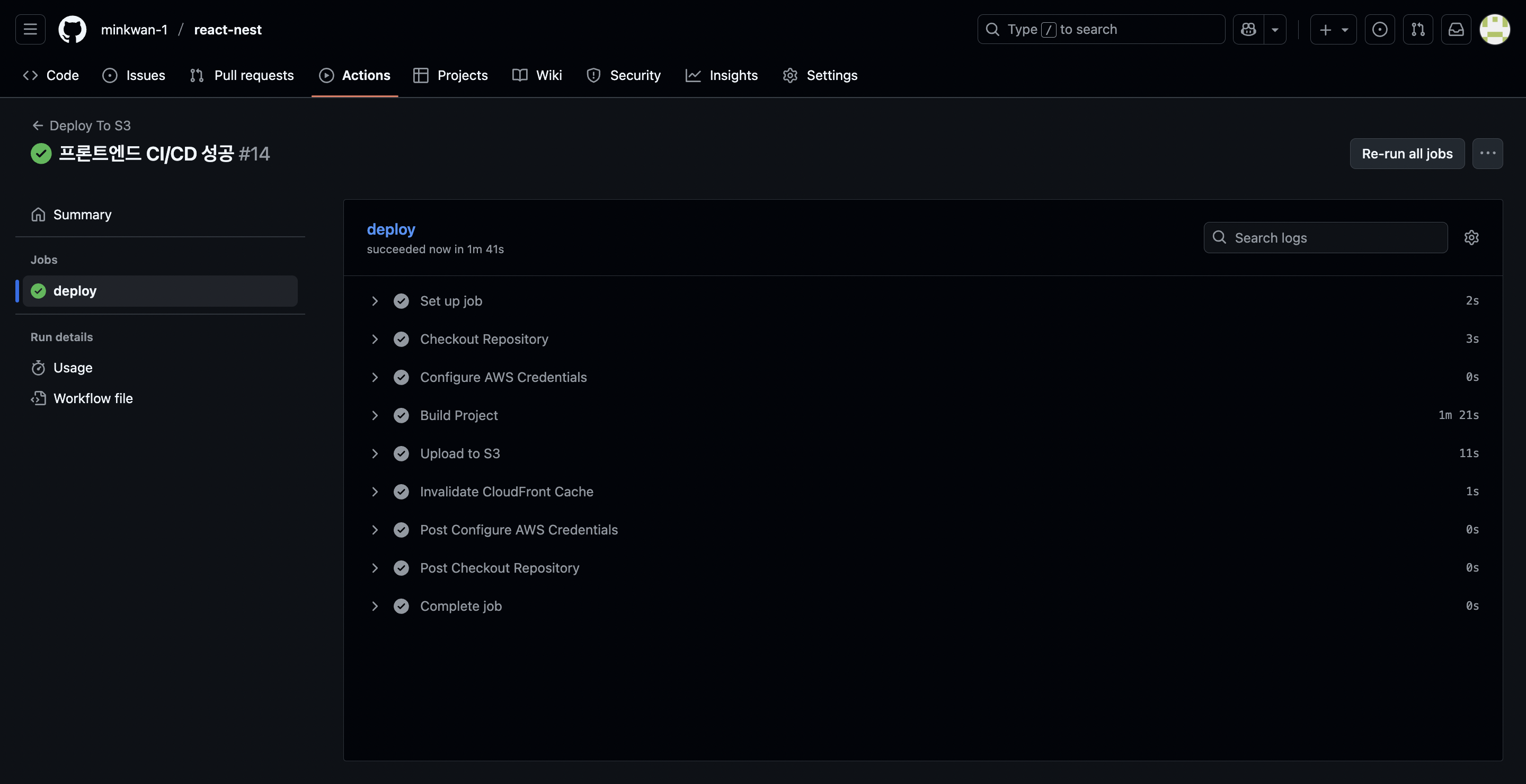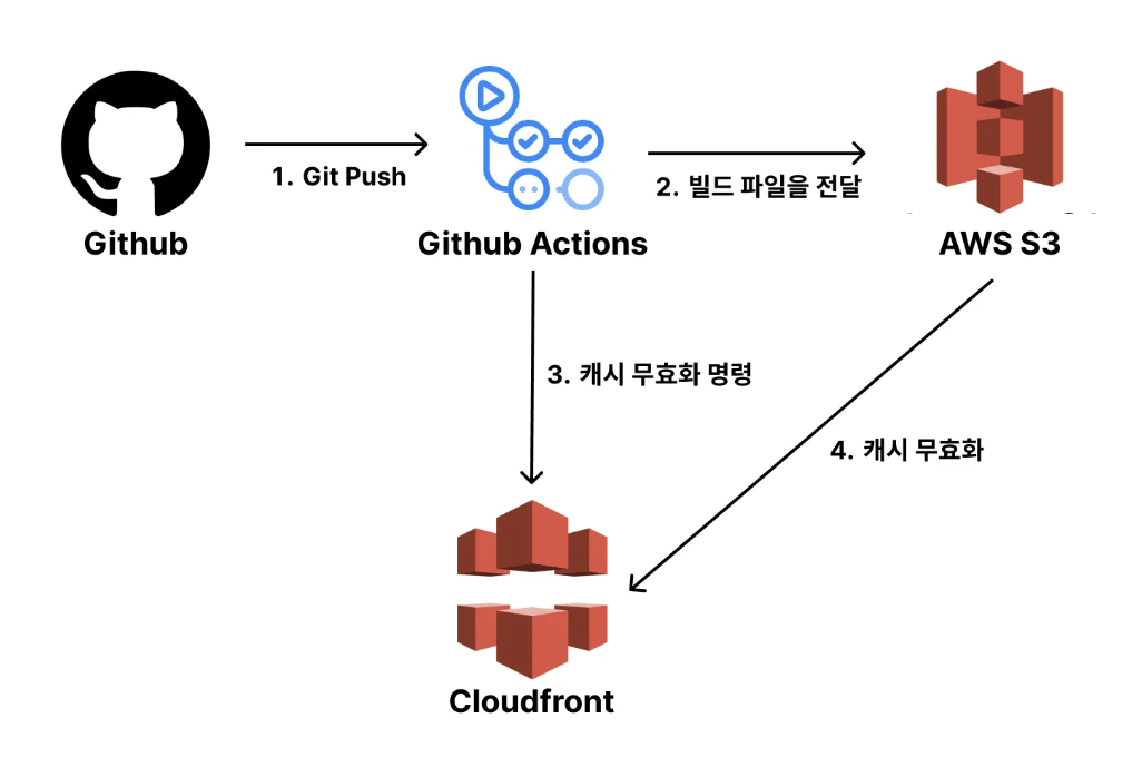 Github Actions가 push를 통해 트리거 되어, 1) 빌드 파일을 S3에 전달하여 업로드하고, 2) 캐시 무효화 명령을 내리는 것까지 적용해 보겠습니다.