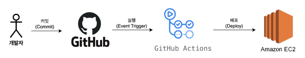 개발자가 코드를 작성한 후 commit을 하고 GitHub에 push 하면, GitHub는 Push를 감지해서 Github Actions에 작성한 로직을 실행합니다. 여기서 말하는 로직은 빌드 / 테스트 / 배포에 관한 로직이겠죠. 마지막으로 서버에서는 배포된 최신 코드로 서버를 재실행합니다.