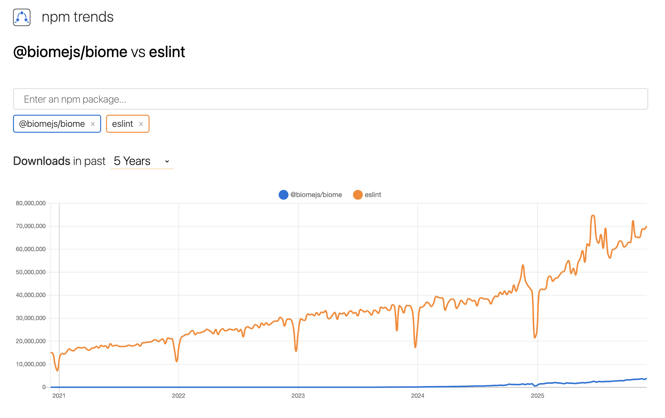 Weekly Downloads가 394만으로 결코 적은 숫자는 아니지만, npm trends를 확인해 보니 아직 Biome가 ESLint의 아성을 뛰어넘기는 쉽지 않겠다는 판단을 했습니다. 그리고 Rust로 작성되어 JavaScript 개발자들이 오픈소스에 접근하기 어려워 성장 속도가 가파르지 않을 것 같다는 생각도 들었습니다.