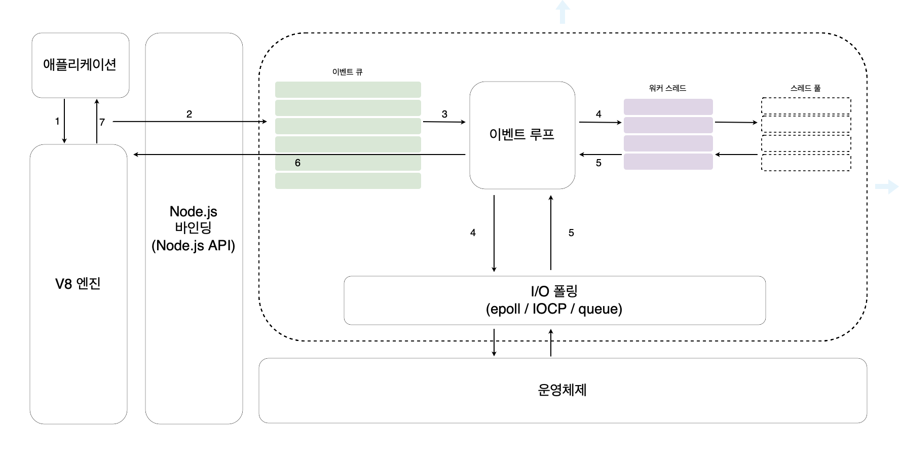 - V8 엔진은 이벤트 루프로 libuv를 사용하고, 전달된 요청을 libuv 내부의 이벤트 큐에 추가합니다.
