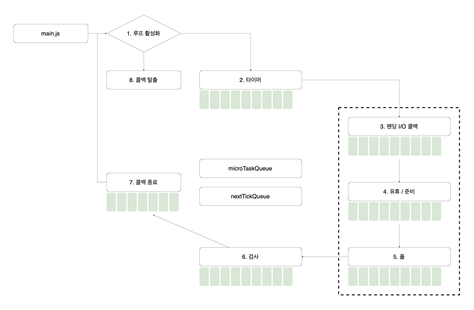 - microTaskQueue와 nextTickQueue에 있는 작업은 각 단계마다 우선적으로 실행합니다.(nextTickQueue의 작업의 우선순위가 microTaskQueue 작업의 우선순위보다 높습니다.)