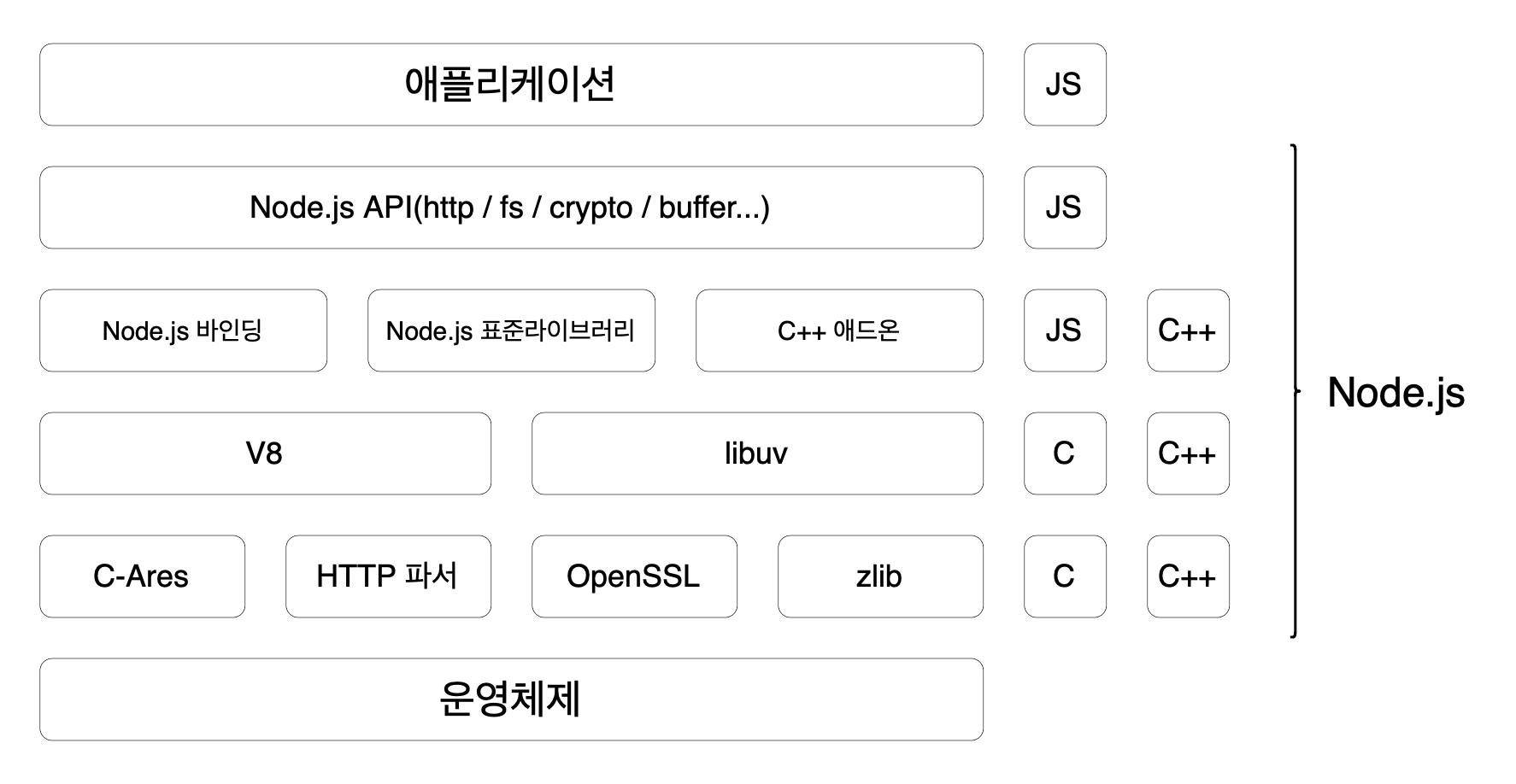 - 자바스크립트로 작성된 Node.js의 API는 C++로 작성된 코드를 사용합니다.