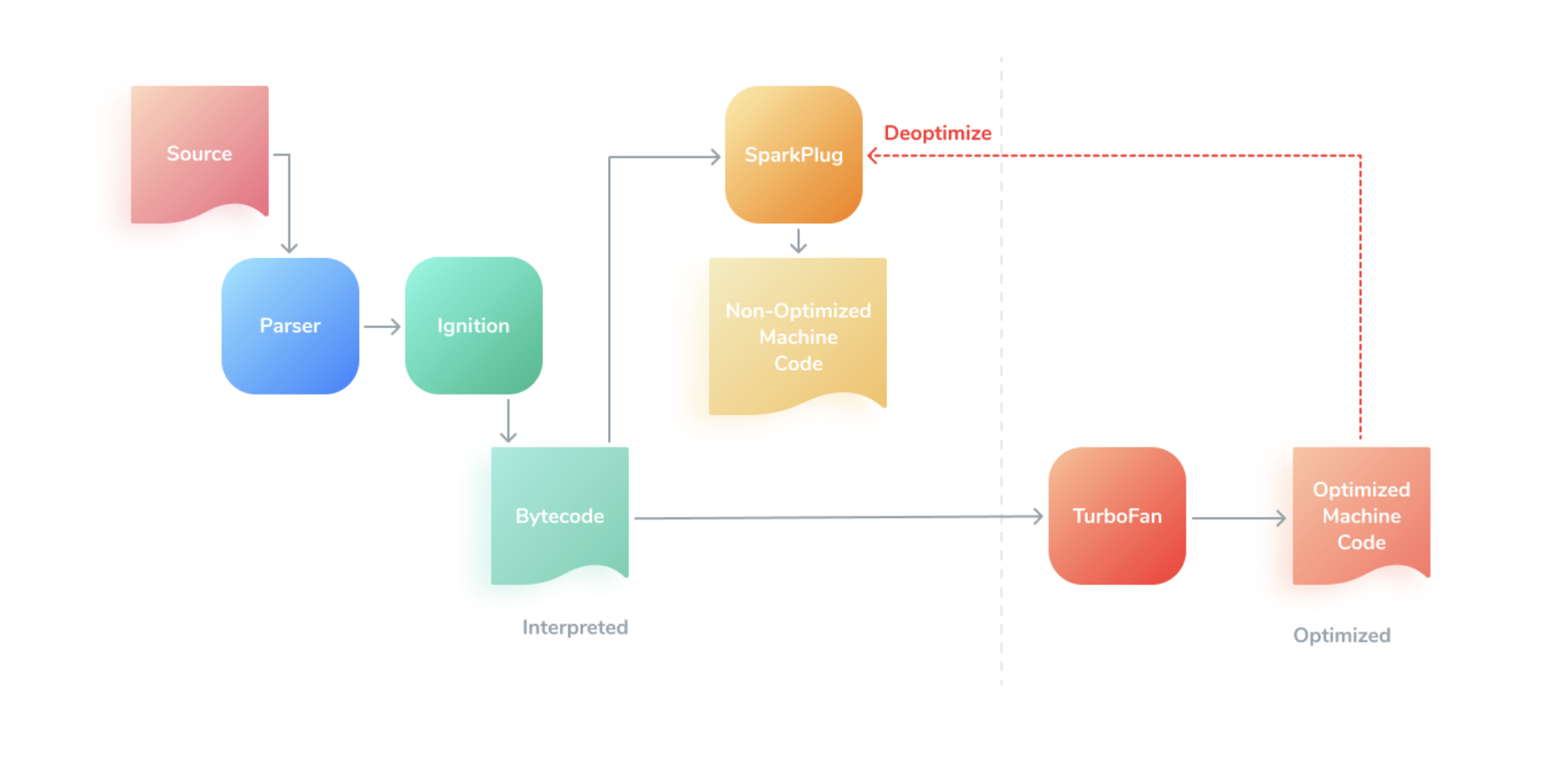 - Deoptimize: 만약 TurboFan이 최적화한 코드의 가정이 틀어지면, V8은 최적화된 기계 코드를 버리고 다시 SparkPlug가 만든 비최적화 코드나 Ignition의 Bytecode로 돌아가서 실행을 이어갑니다.