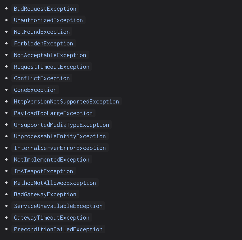 NestJS는 기본 HttpException을 상속하는 여러 내장 예외 클래스를 제공합니다. 이러한 예외 클래스들은, 자주 발생하는 HTTP 오류 상황을 다루기 위해 만들어졌습니다. 예외 처리 시 필요에 따라 적절한 클래스를 활용할 수 있습니다.