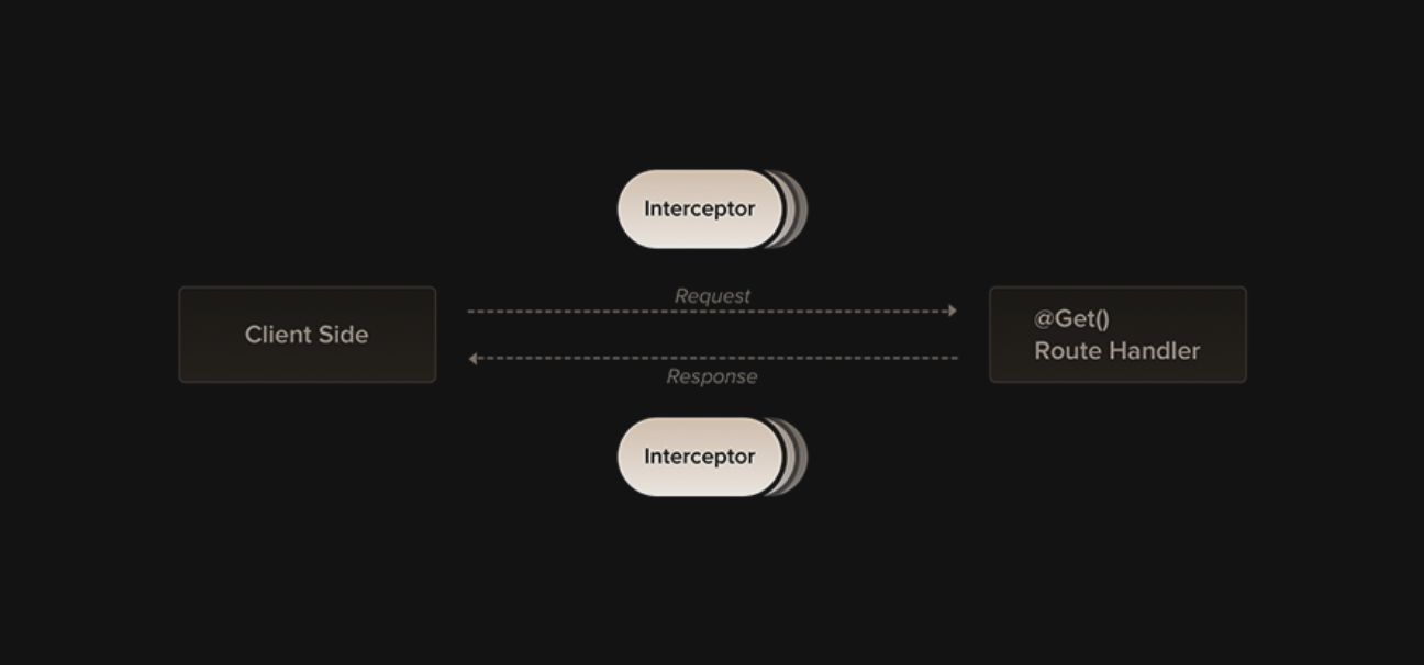 Interceptor는 그 이름에 걸맞게, 클라이언트와 컨트롤러 내 라우트 핸들러의 중간 지점에서, 요청 또는 응답을 가로채는 역할을 합니다.