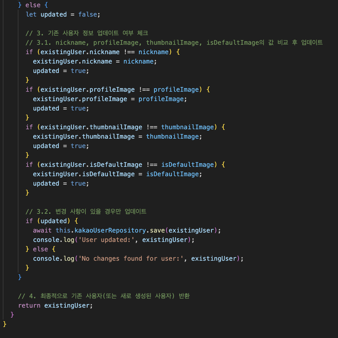 else라면, 즉 기존 사용자라면 업데이트에 관한 처리를 진행한다. 개별 유저 정보가 기존 유저 정보와 일치하지 않는 상황이라면, 변경된 정보로 유저 정보를 update 한다. 그리고 각 과정에서 updated 변수를 true로 변환해 준다.