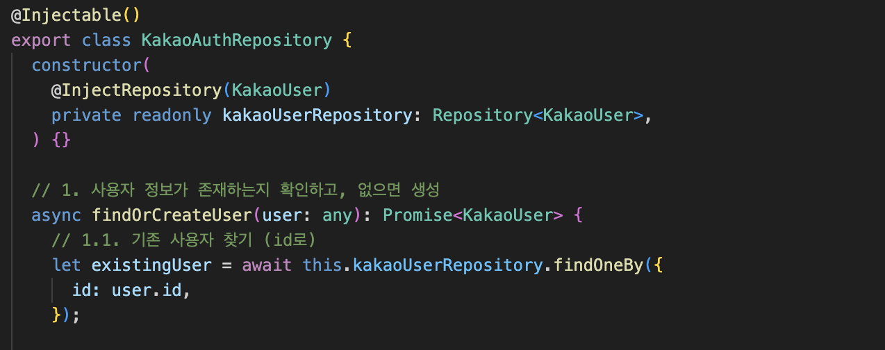 우선 findOneBy() 메서드를 통해 기존 사용자 여부를 id로 체크한다.