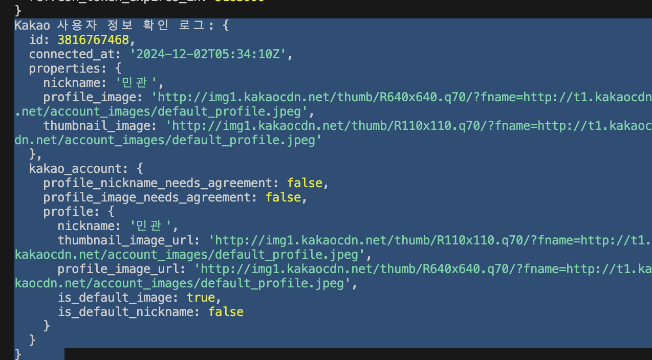 카카오 서버에, 헤더에 access token을 담았으니 사용자 정보를 달라는 요청을 수행한다. 지금까지의 과정을 잘 수행했다면, 사용자 정보를 받을 수 있다.