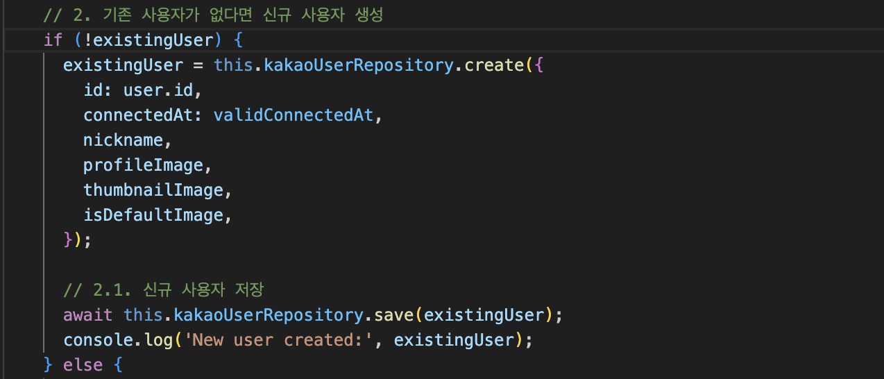 !existingUser라면, 즉 기존 사용자가 아니라면 create 메서드를 통해 새로운 유저 정보를 Database에 저장한다.