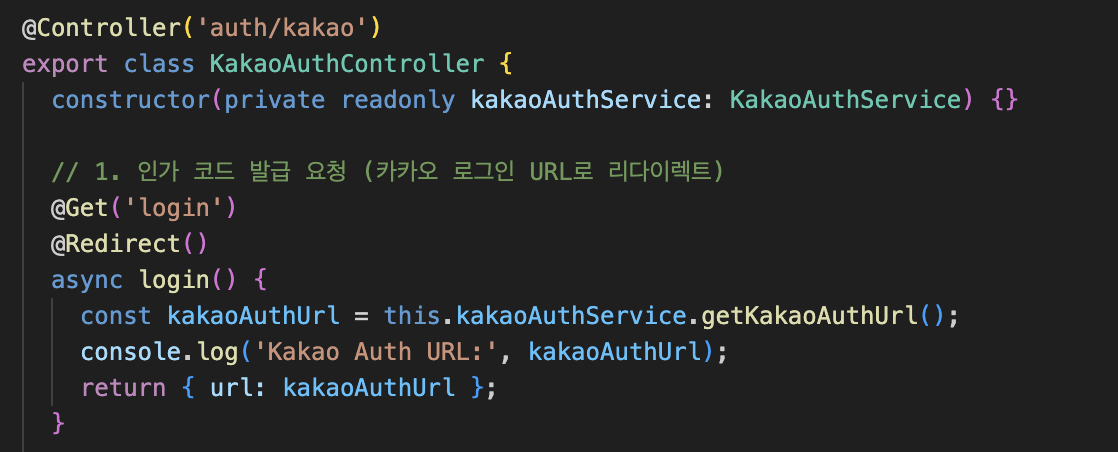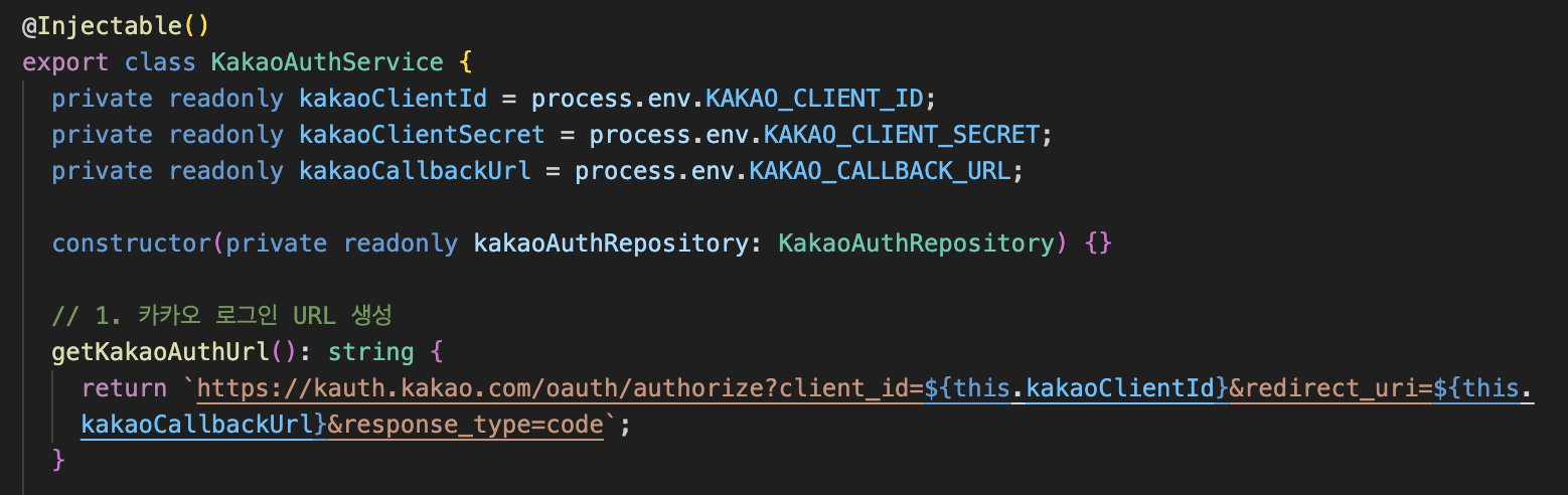 컨트롤러의 3000/kakao/login 로직에서는 getKakaoUrl() 함수를 실행하고 있다. 해당 함수는 서비스 파일에 구체화되어 있다.