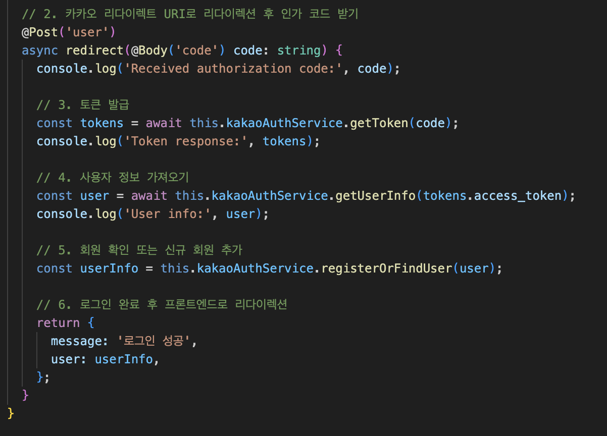 3000/auth/kakao/user 서버로 이동하여, 이후 로직을 수행하게 된다.