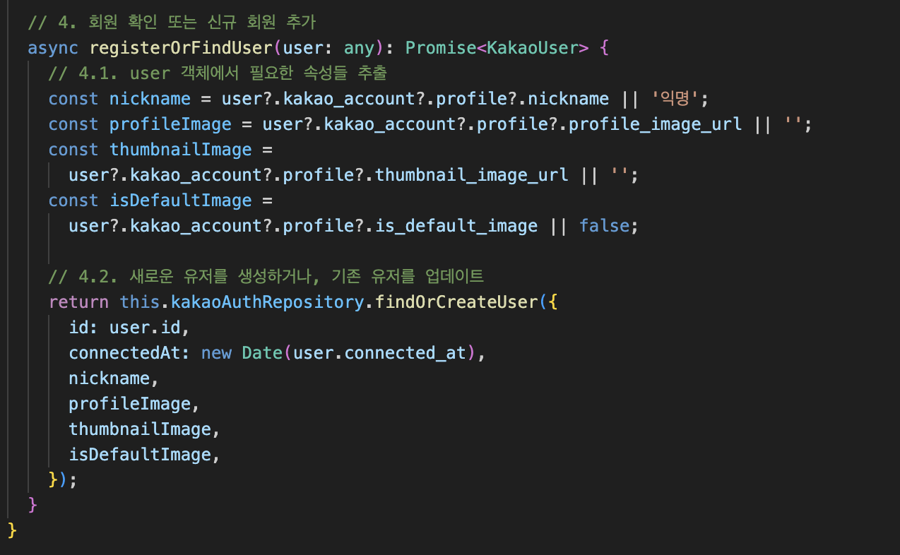 마지막으로 registerOrFindUser(user) 함수가 실행된다. 카카오로부터 받은 사용자 정보에서 우선적으로 필요한 데이터를 추출한다.