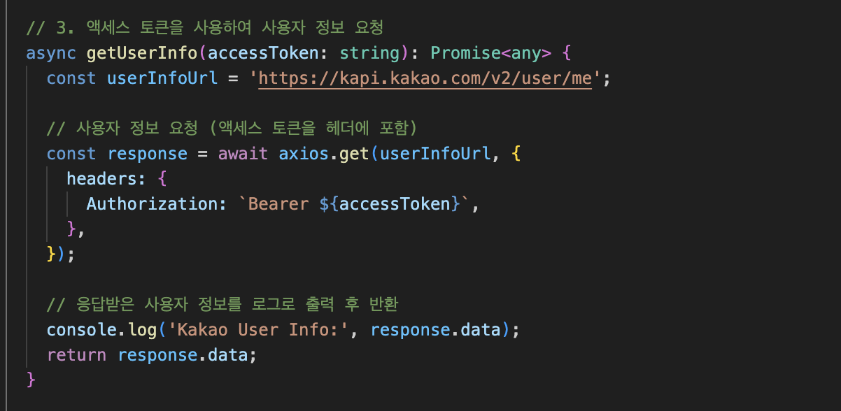 다음으로 getUserInfo(tokens.access_token) 함수를 실행한다. 액세스 토큰은 사용자 정보를 가져오기 위한 토큰이다.