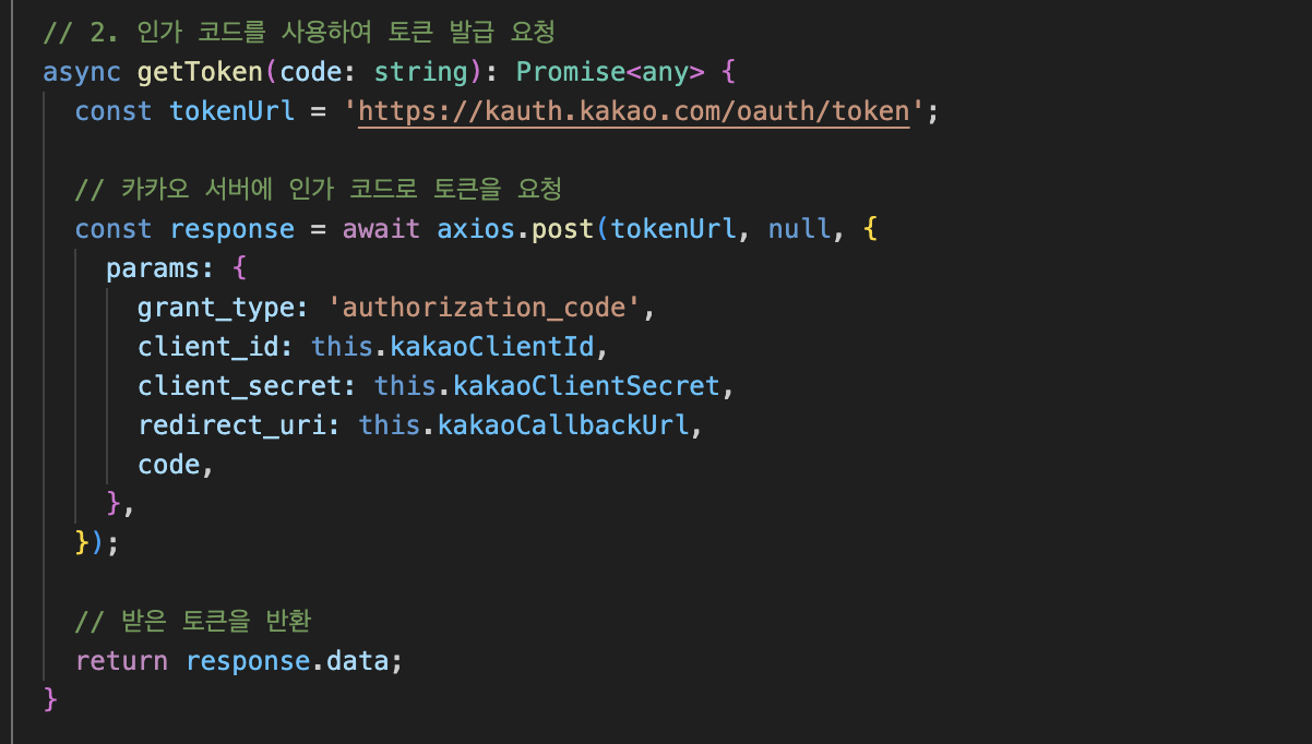 서비스 로직의 getToken(code) 함수가 가장 먼저 실행된다. 카카오 서버로 인가 코드를 통해 '토큰'을 요청하게 된다. 카카오 프로바이더가 요구하는 형식을 맞춰주면 되고, 해당 내용은 카카오 디벨로퍼 공식문서에 명시되어 있다.