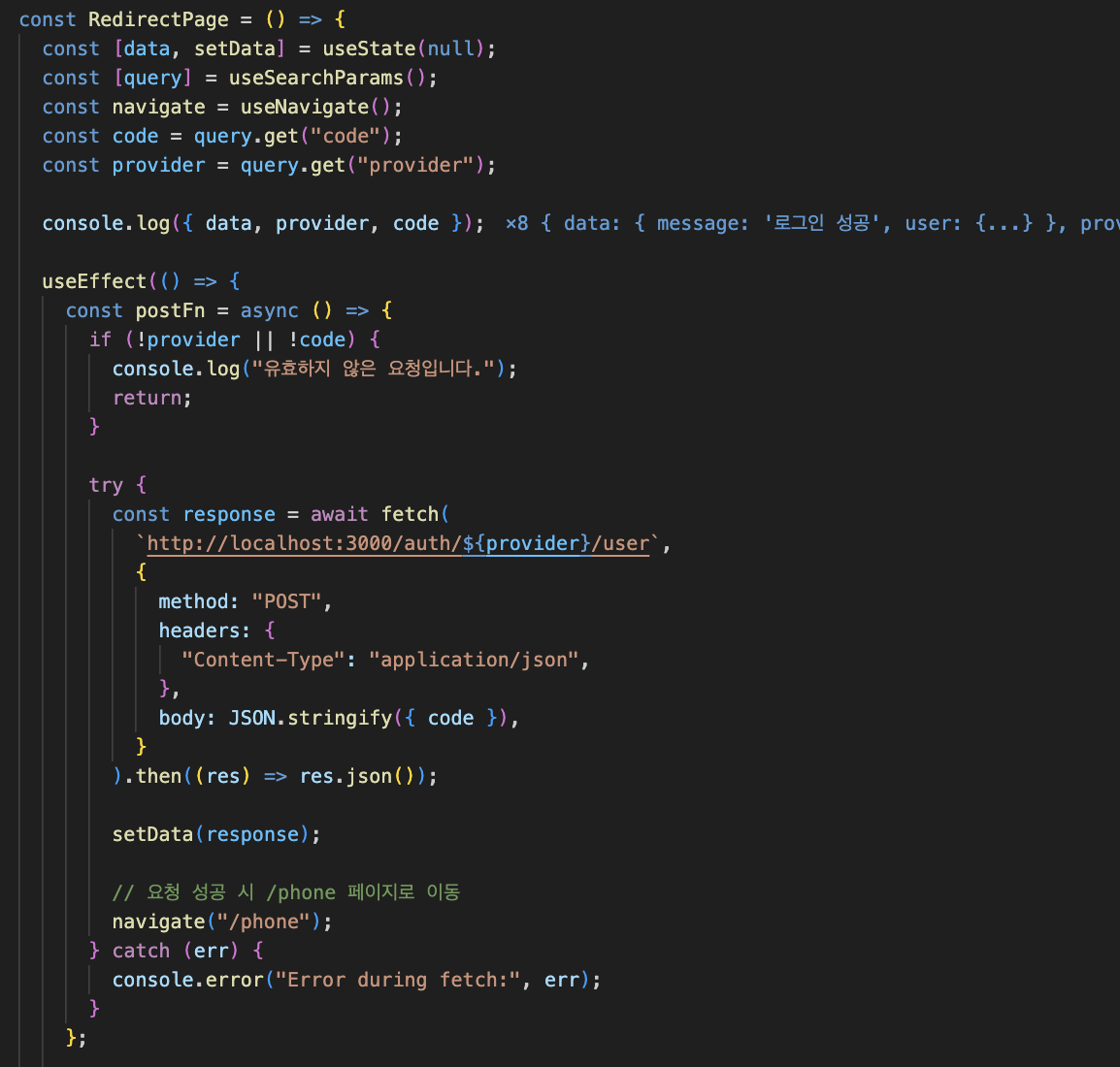 추가적으로 모든 요청이 성공적으로 완료된 후에는 Phone Verification을 위해 사용자를 /phone 경로로 이동시킨다.