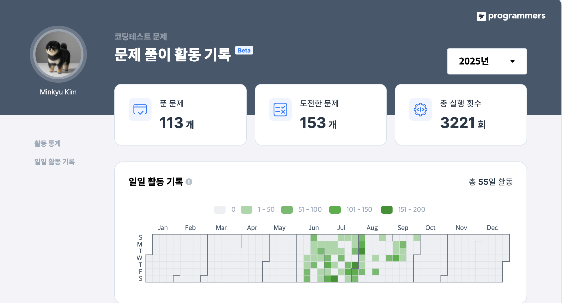프로그래머스는 문제풀이 활동을 얼마나 했는지 기록을 해줍니다. 다음과 같이요.
