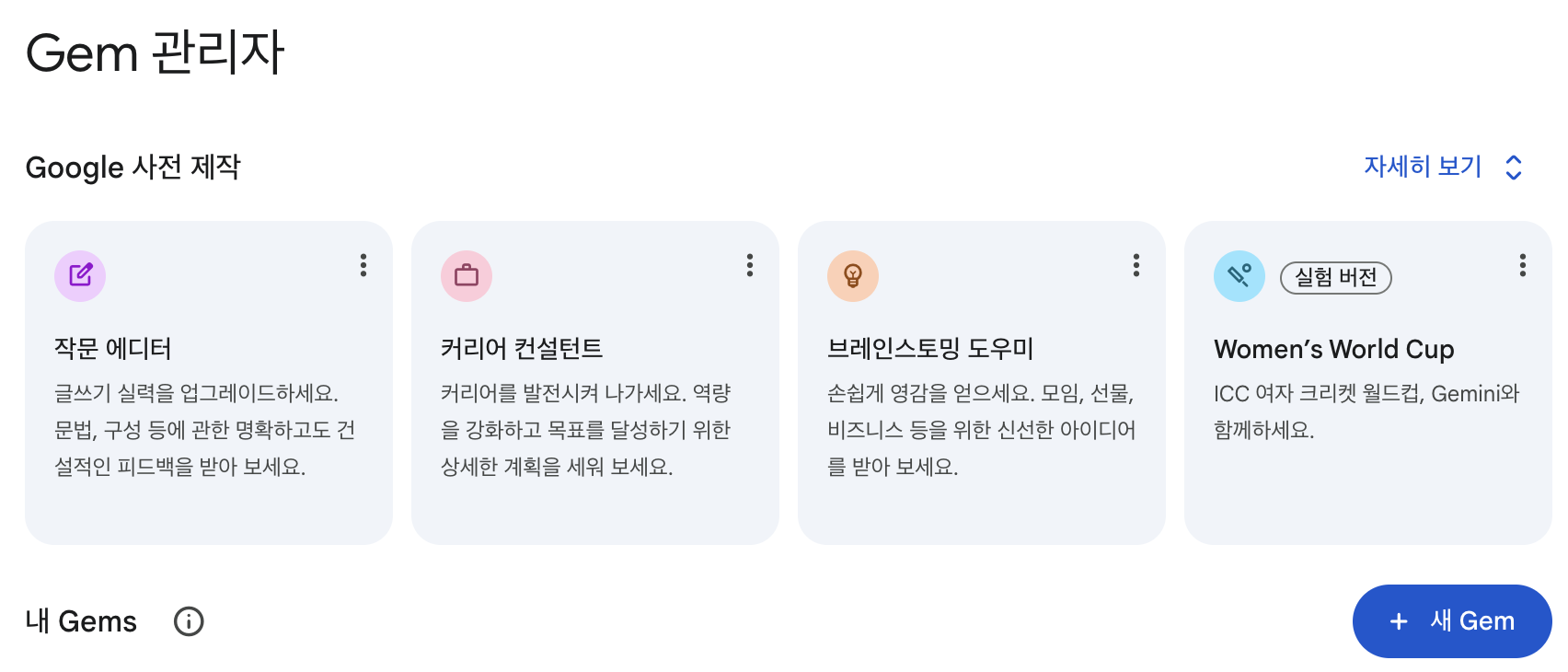 자세한 설명은 https://gemini.google/kr/overview/gems/?hl=ko 에서 확인할 수 있습니다.