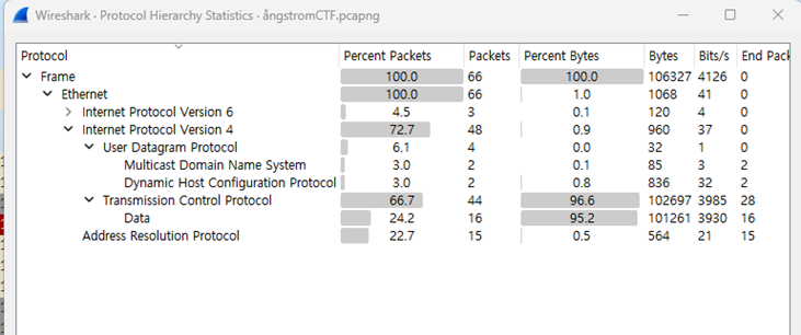 또한 나는 패킷들을 대충 확인하고 TCP패킷이 더 많아 보여서 TCP stream 을 follow했는데 statistics->protocol hierarchy에서 패킷이 차지하는 비율을 확인할 수 있다. 이 문제의 경우 아래와 같이 UDP패킷보다 TCP패킷의 구성비율이 더 많으므로 TCP패킷에 대부분의 정보가 있는 것을 알 수 있다.