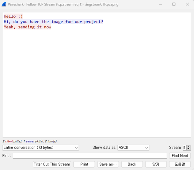 이를 통해 Stream 1에서 대화내용을 알 수 있다. 그럼 상대 이미지를 지금 보내고 있다는 메시지를 보낸 클라이언트가 바로 다음에 이미지를 보냈는지 확인해 봐야겠다. Stream 2에서 해독되지 않은 정보 모두 이미지를 보내겠다는 클라이언트가 보낸 것이므로 Stream 2가 이미지 정보인 것을 추측할 수 있다.