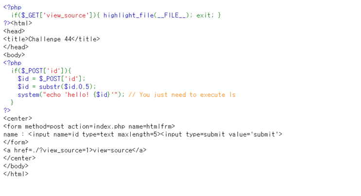 system("echo 'hello! {$id}'"); // You just need to execute ls