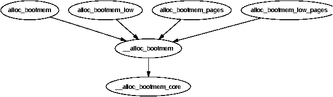 reserve_bootmem() 또한 사용할 페이지를 예약하기위해 사용될 수 있지만, 이는 범용적인 할당을 위해서는 사용하기 매우 번거롭다. UMA 아키텍처의 경우 쉬운 할당을 위해 alloc_bootmem(), alloc_bootmem_low(), alloc_bootmem_pages() 그리고 alloc_bootmem_low_pages() 함수가 제공되며, Table 5.1에 설명이 나와있다. 이 함수들의 call graph가 Figure 5.1에 나와있다.