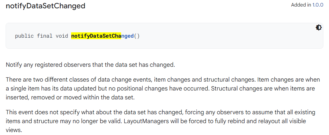 https://developer.android.com/reference/androidx/recyclerview/widget/RecyclerView.Adapter#notifyDataSetChanged()